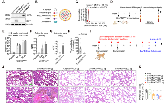 研究發(fā)現(xiàn),“該環(huán)狀 RNA 疫苗可以在小鼠和恒河猴體內(nèi)誘導(dǎo)產(chǎn)生高水平的新冠病毒中和抗體以及特異性 T 細(xì)胞免疫反應(yīng),并可以有效降低新冠病毒感染的恒河猴肺部的病毒載量,顯著緩解新冠病毒感染引起的肺炎癥狀?!?