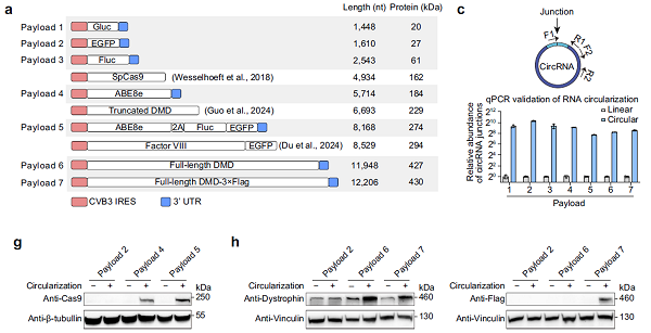 利用CIRC技術(shù),研究團(tuán)隊(duì)成功環(huán)化了編碼全長肌營養(yǎng)不良蛋白(約 12,206 個核苷酸)的 RNA,并實(shí)現(xiàn)了 427 KDa 蛋白的完整表達(dá)。這一重大突破,徹底打破了環(huán)化 RNA 編碼蛋白大小的限制,為大分子量蛋白缺失相關(guān)疾病的治療開辟了全新路徑。
